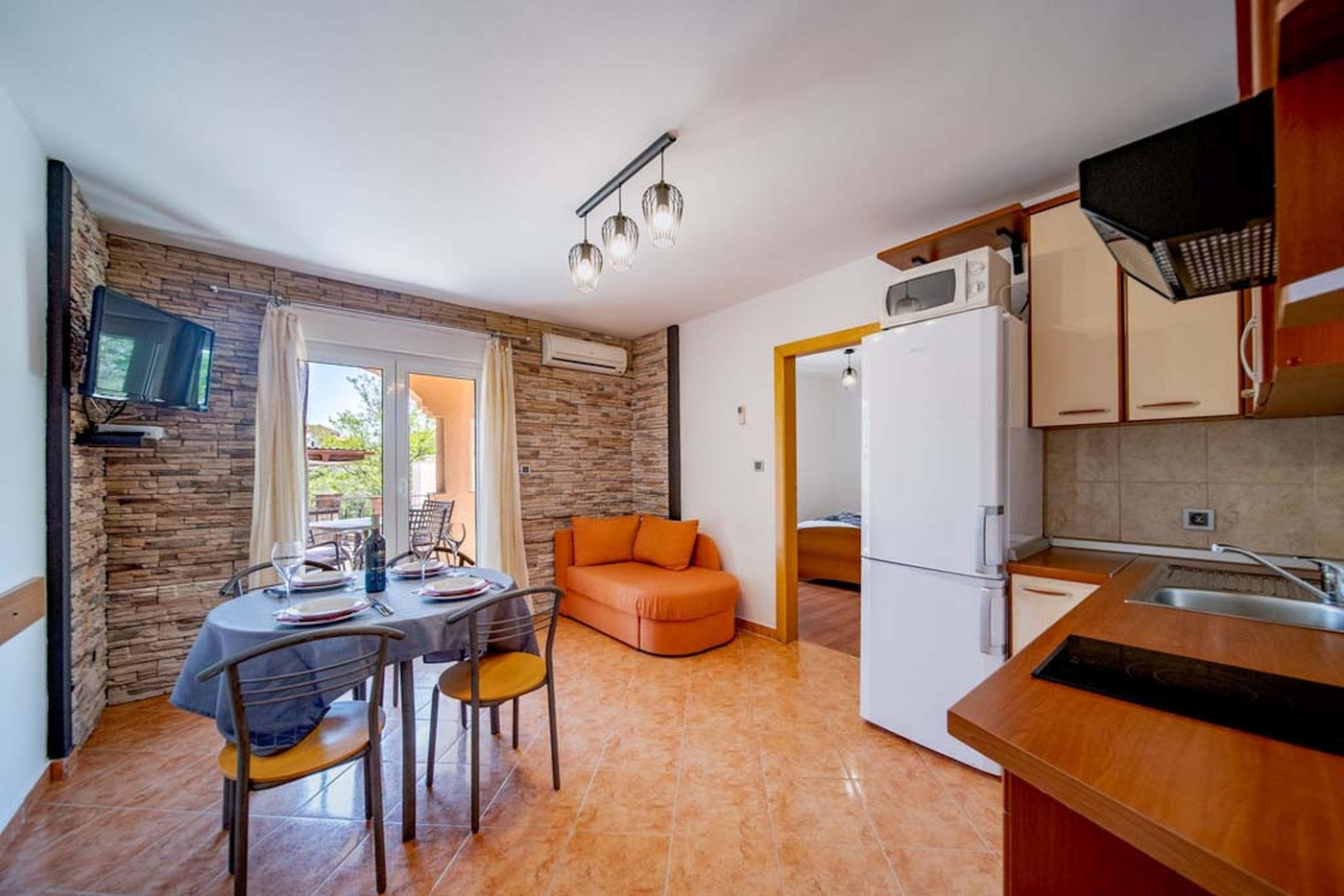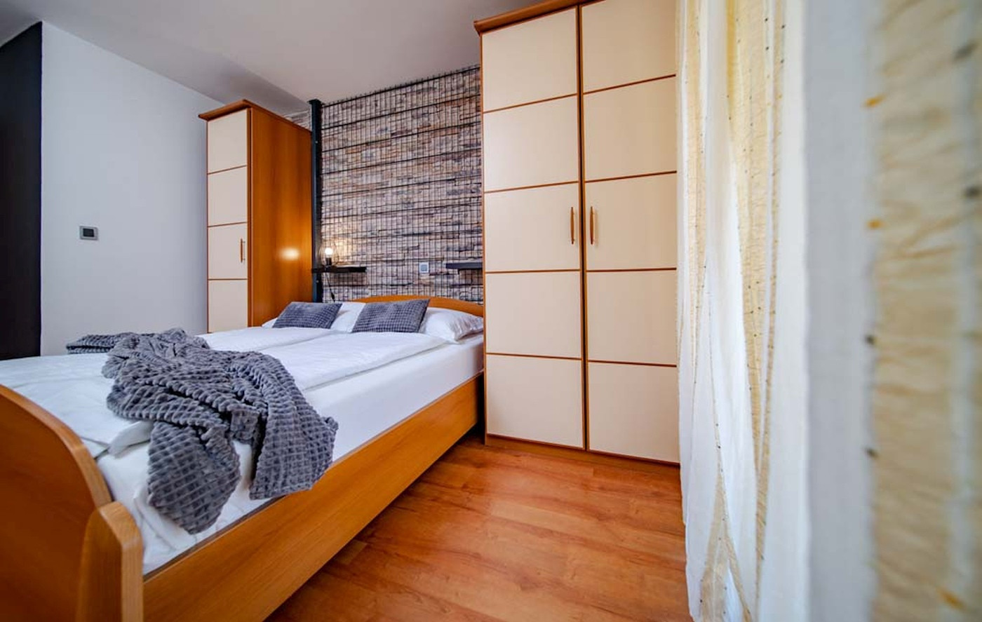On approximately 30 m², you will find a cosy bedroom with a double bed and a living area with a sofa bed, ideal for children. The apartment is air-conditioned and has Wi-Fi, so you can stay comfortably connected even on holiday. The separate kitchen is functionally equipped and is perfect for self-catering. The modern bathroom has a shower and toilet.
