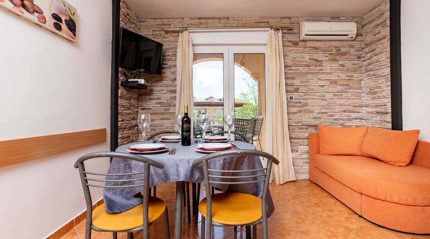 The cosy holiday apartment on the island of Rab in the popular holiday resort of Lopar offers space for up to 4 guests on 55 m² and is ideal for couples or small families who want to enjoy proximity to the beach and relaxed holiday days. The accommodation has two bedrooms with double beds, a bathroom with shower, WC and window, and an open living area with sofa bed, kitchenette and dining area. Two covered balconies allow meals outdoors or relaxed hours in the fresh air. Air conditioning, WiFi and a separate entrance provide additional comfort. A baby bed is available on request, pets are not allowed.