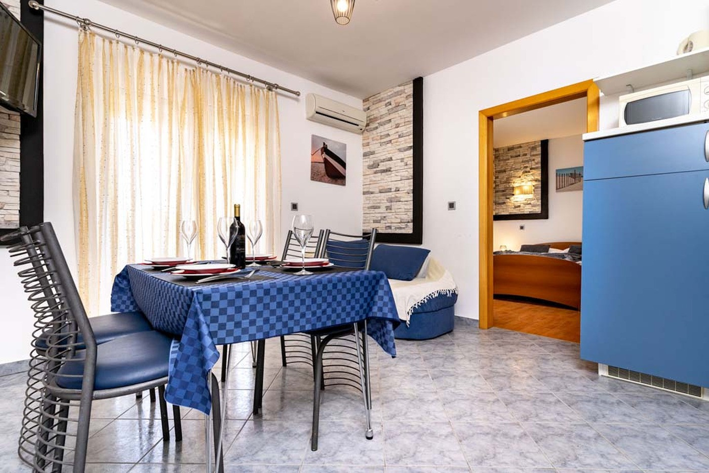 This comfortable holiday apartment on the island of Rab in the holiday resort of Lopar offers space for up to 4 guests on 55 m² and is ideal for couples, small families or friends who want to enjoy proximity to the beach and relaxing holiday days. The accommodation has two bedrooms with double beds, a bathroom with shower, WC and window, and an open living area with sofa bed, kitchenette and dining area. Two covered balconies invite you to have breakfast or spend relaxing hours outdoors. Air conditioning, WiFi and a separate entrance provide additional comfort. A baby bed is available on request, pets are not allowed.