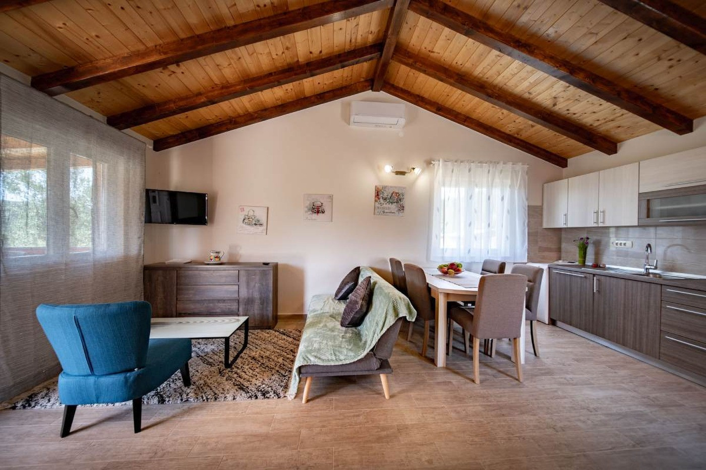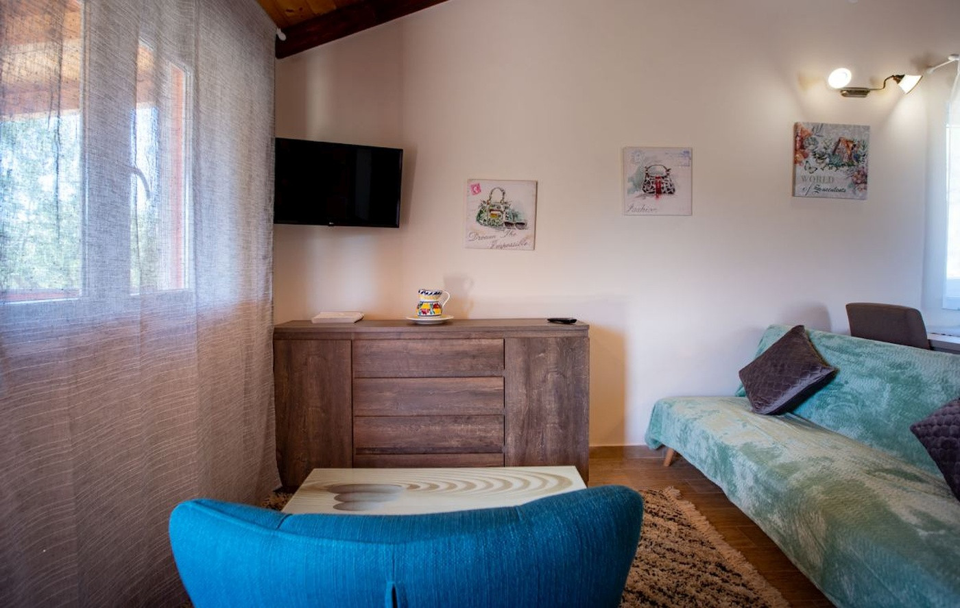 The house offers space for up to four people on 50 m² and combines rural charm with modern comfort. It features a bedroom with a queen-size bed and a comfortable sofa bed in the living area. The highlight is the spacious terrace with a jacuzzi, where you can relax after a day at the sea and enjoy the view of the greenery.