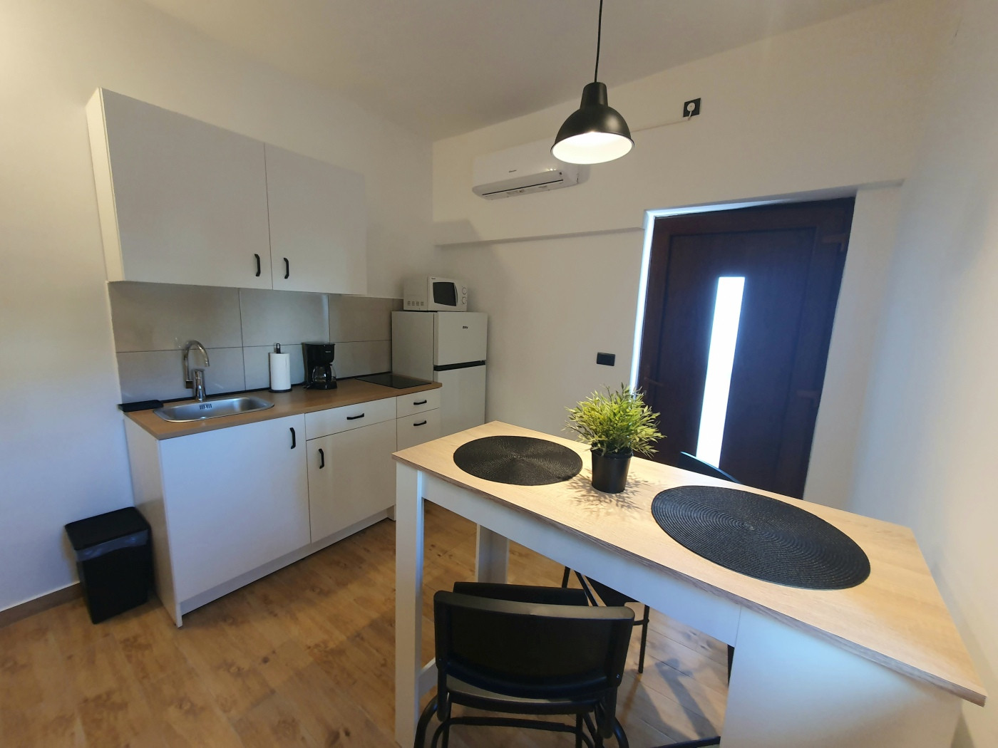 En la línea de cocina completamente equipada con placa de cocina eléctrica, refrigerador, microondas, horno, congelador, cafetera, hervidor de agua, vajilla y utensilios de cocina, podrá abastecerse sin problemas.