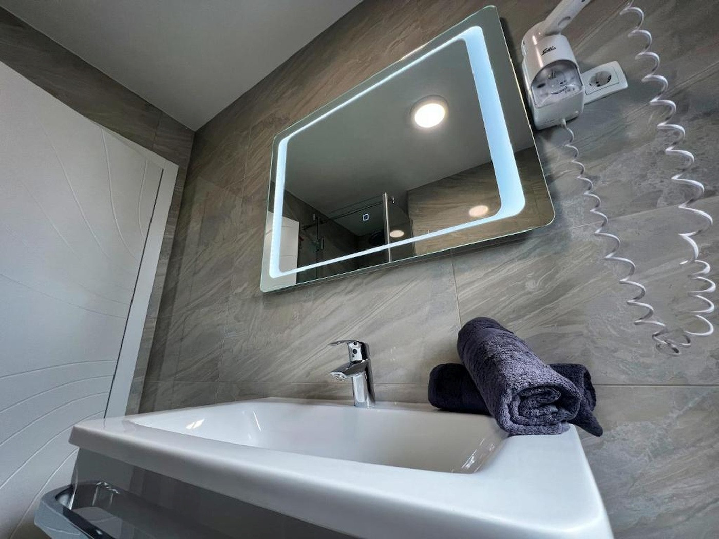 L'espace lumineux de séjour et de repas invite à la détente et offre suffisamment de place pour des repas en commun ou des soirées relaxantes devant la télévision avec la télévision par satellite. Le Wi-Fi est bien sûr à votre disposition, vous permettant de rester en ligne à tout moment même pendant les vacances. Grâce à la climatisation, vous profitez d'un climat intérieur agréable même lors des journées d'été les plus chaudes, tandis que le chauffage central assure une chaleur réconfortante pendant la saison plus fraîche. Un sèche-cheveux est également disponible et complète l'équipement confortable.