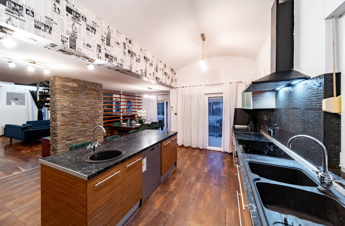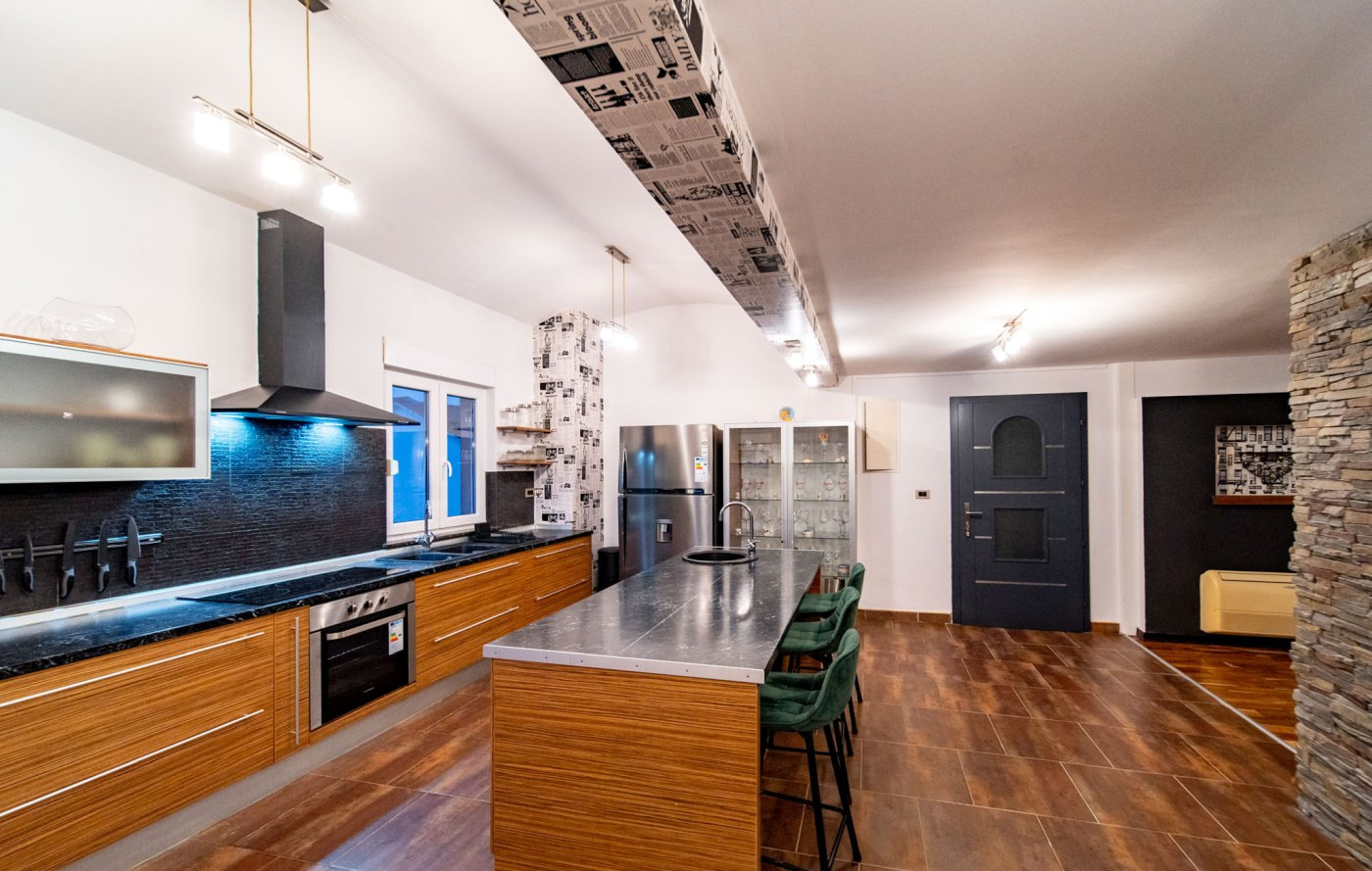La cucina americana, a induzione, è attrezzata con frigorifero, microonde, forno, congelatore, lavastoviglie, stoviglie/posate, utensili da cucina, caffettiera e bollitore.