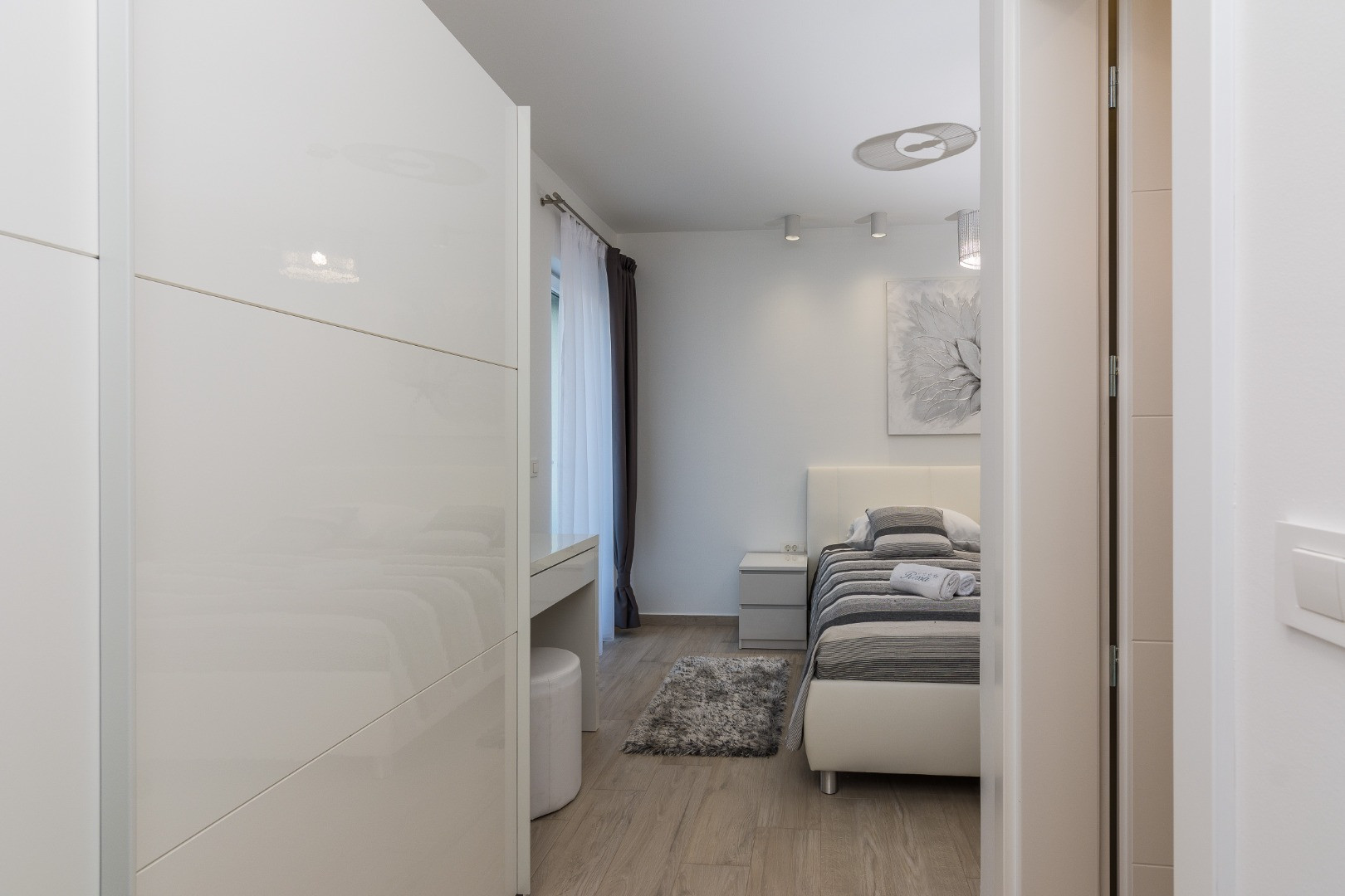 La casa si estende su due piani e convince per il design moderno, l'attrezzatura di alta qualità e gli spazi ampi. Dispone di tre camere da letto confortevoli, ciascuna con il proprio bagno, aria condizionata e balcone con vista mare. Nel complesso, l'alloggio offre spazio per fino a 8 persone (6 adulti + 2 bambini sul divano letto). Due cucine completamente attrezzate e un'ampia zona soggiorno e pranzo creano condizioni perfette per pasti in comune e serate rilassanti.