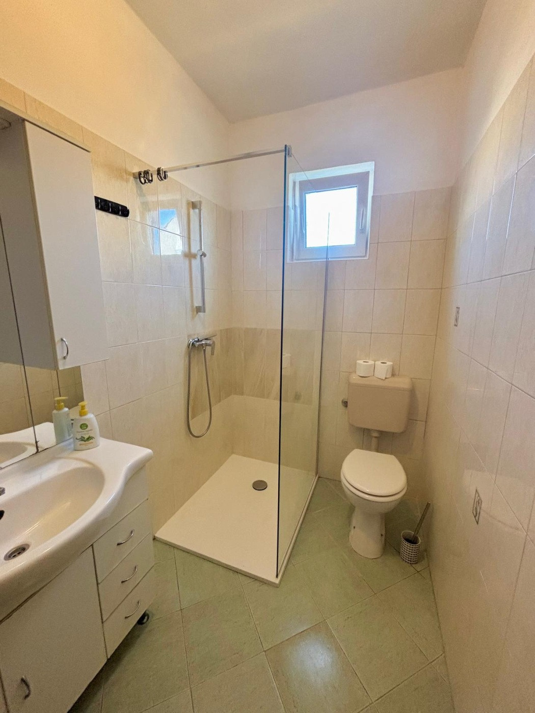 Velice prostorný apartmán, možnost klimatizace ale i ventilátorů umístěných na stropě. Já klimatizaci vůbec nepotřeboval využít. Dům je ukryt ve stínu a jedná se o první patro a díky tomu je i v horkých letní dnech v apartmánu příjemně. Jediné co je potřeba pro spánek či příjemnější pobyt tak zapnout ventilátor na stropě, který je ve všech pokojích a kuchyni.