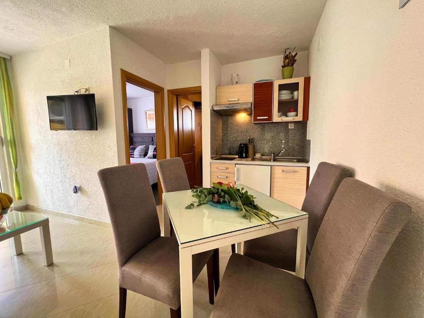 Wyposażenie apartamentu obejmuje darmowe WiFi, telewizję satelitarną, klimatyzację (dostępną za dodatkową opłatą) oraz wszystkie niezbędne akcesoria kuchenne – w tym ekspres do kawy, czajnik i toster. Pościel, ręczniki oraz ściereczki kuchenne są zapewnione i regularnie wymieniane bez dodatkowych opłat. Na życzenie udostępnimy również ręczniki kąpielowe.