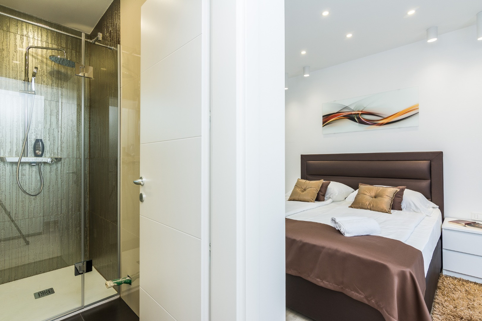 Dom rozciąga się na dwie kondygnacje i zachwyca nowoczesnym designem, wysokiej jakości wyposażeniem i przestronnymi pomieszczeniami. Posiada trzy komfortowe sypialnie, każda z własną łazienką, klimatyzacją i balkonem z widokiem na morze. Ogółem zakwaterowanie oferuje miejsce dla maksymalnie 8 osób (6 dorosłych + 2 dzieci na rozkładanej sofie). Dwie w pełni wyposażone kuchnie i przestronny salon z jadalnią stwarzają idealne warunki do wspólnych posiłków i relaksujących wieczorów.