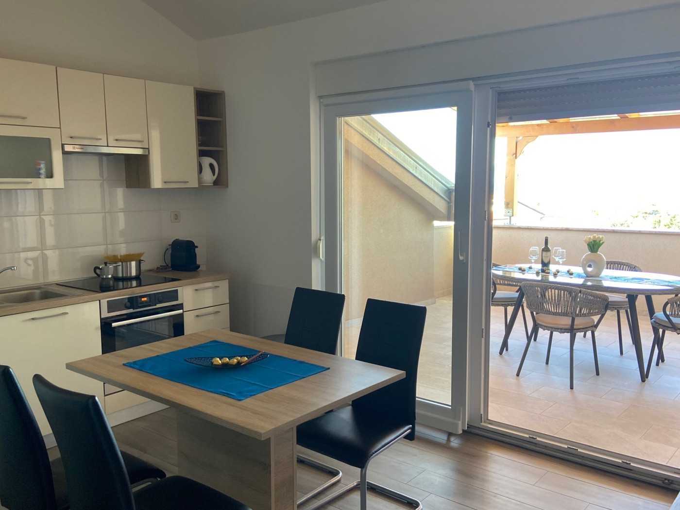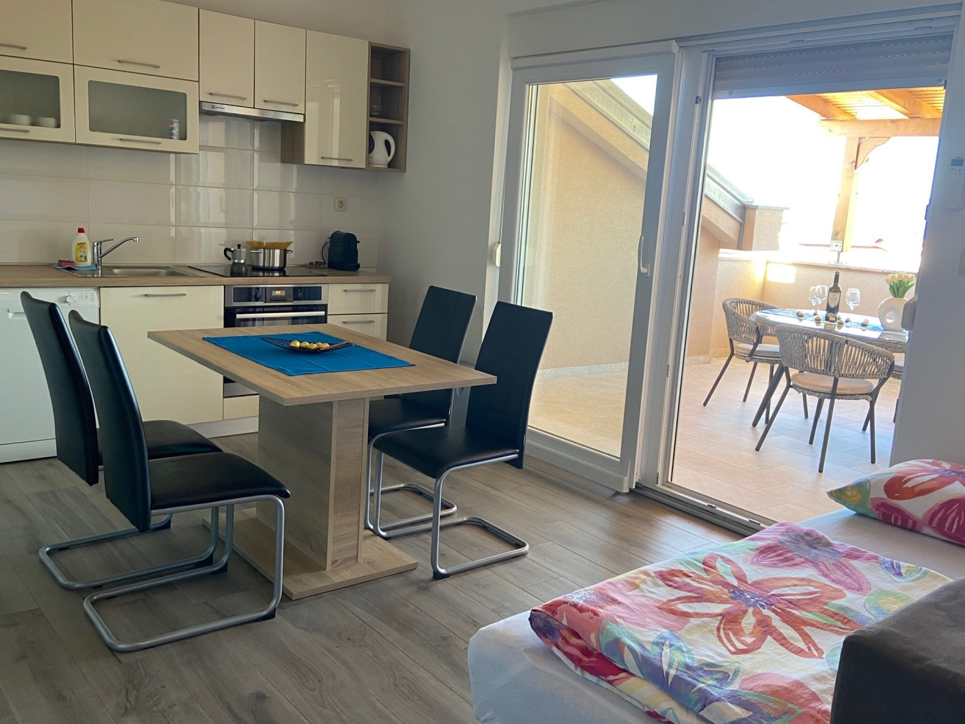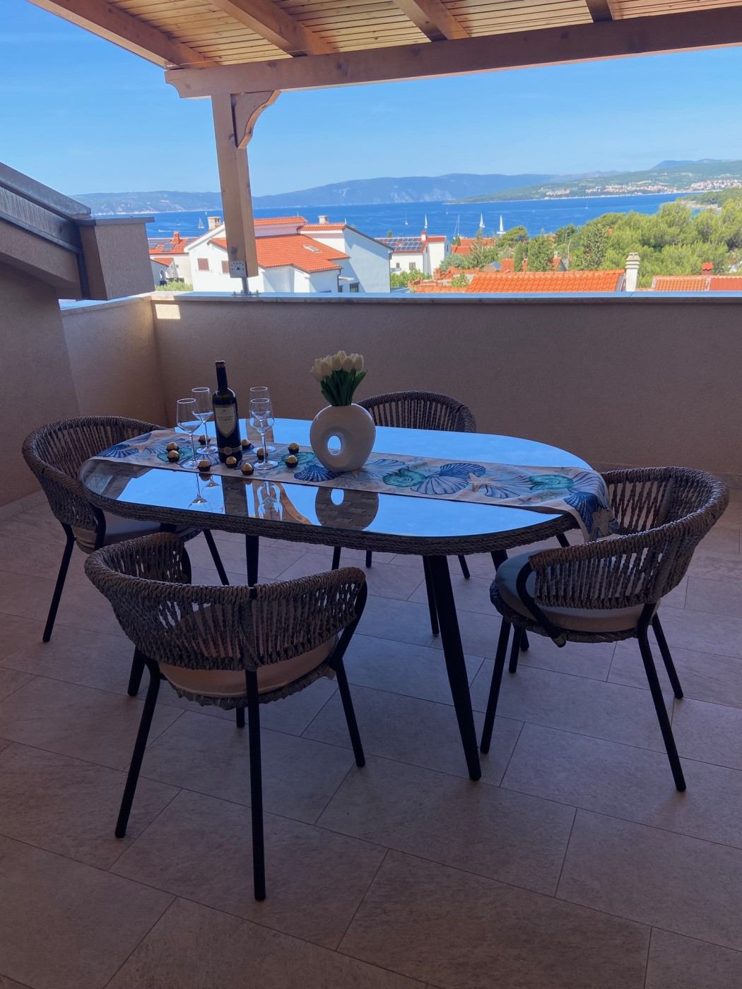 Крытый балкон (10 м²) с частичным видом на море приглашает насладиться едой на свежем воздухе. Стол со стульями рассчитан на четыре человека – идеально подходит, чтобы начать день с завтрака на утреннем солнце или завершить его бокалом вина вечером.