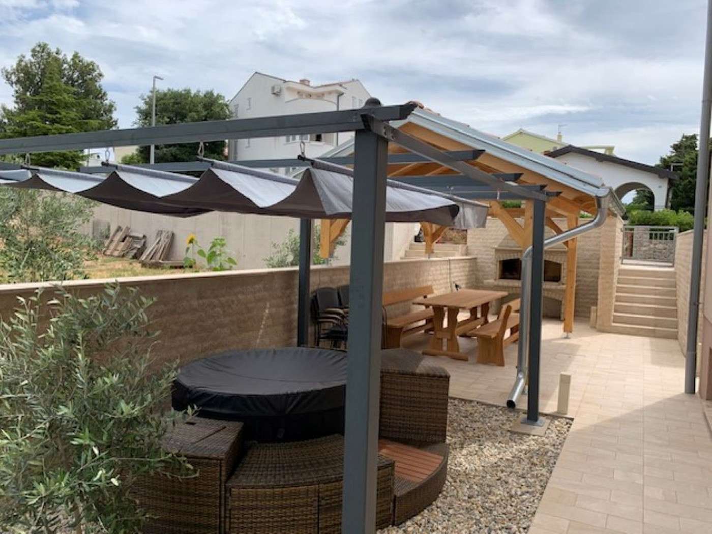 Квартира имеет большую крытую лоджию площадью 10 м², где вы можете насладиться днем с завтраком или ужином на свежем воздухе. Частная парковка расположена прямо у дома. Жилье находится всего в 350 метрах от пляжа, так что галечный пляж легко доступен пешком. Окрестности отличаются спокойным соседством, многочисленными кафе, возможностями для отдыха, такими как пляжный волейбол, водные горки и прогулки на лодках, а также предложениями для детей и семей, которые обеспечивают разнообразный отдых.