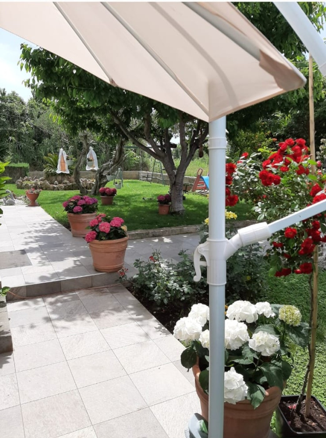 Besonders einladend ist die große überdachte Terrasse, die sich perfekt für gemeinsame Mahlzeiten eignet. Auch dieser Bereich ist klimatisiert und bietet einen schönen Blick auf das Meer. Der private Garten verfügt über einen gepflegten Rasen, einen Trampolin, Schaukeln und eine Rutsche – ideal für Familien mit Kindern. Auf dem Grundstück stehen bis zu fünf private Parkplätze zur Verfügung.