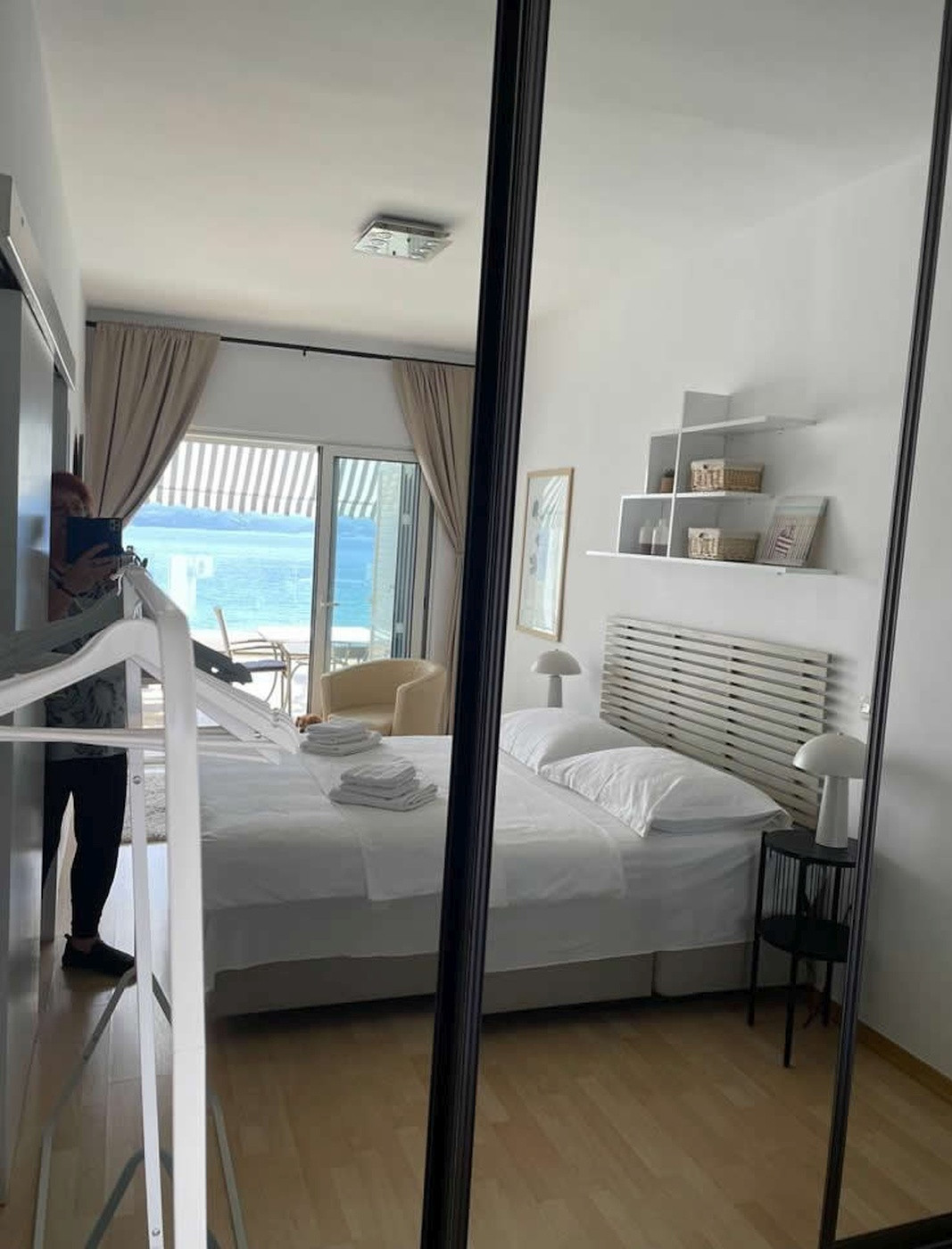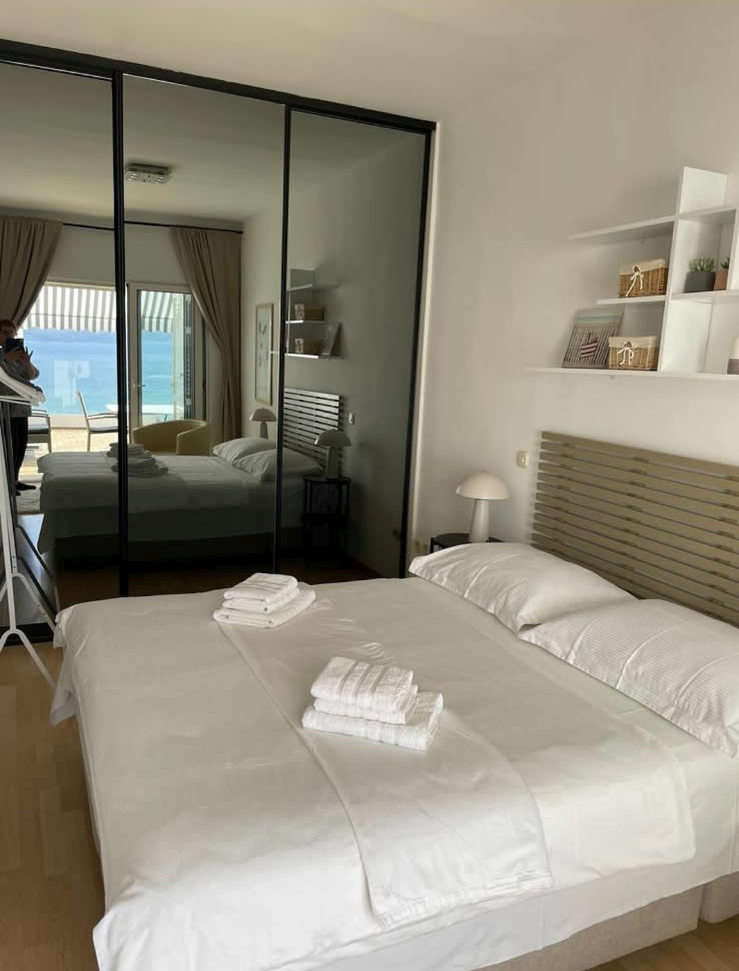 Die Unterkunft bietet zwei komfortable Schlafzimmer, jeweils mit eigenem Bad, Klimaanlage und TV. Insgesamt stehen drei Klimaanlagen und drei Fernseher zur Verfügung – in jedem Zimmer eine. Die Nutzung der Klimaanlage ist selbstverständlich kostenlos. Eine große, voll ausgestattete Küche mit Essbereich lädt zum gemeinsamen Kochen und Verweilen ein. Besonders schön ist die weitläufige Terrasse, die von beiden Schlafzimmern aus zugänglich ist und einen herrlichen Blick auf das Meer bietet – perfekt für entspannte Abende in mediterraner Atmosphäre. Eine kleinere Terrasse neben der Küche ergänzt das großzügige Platzangebot.