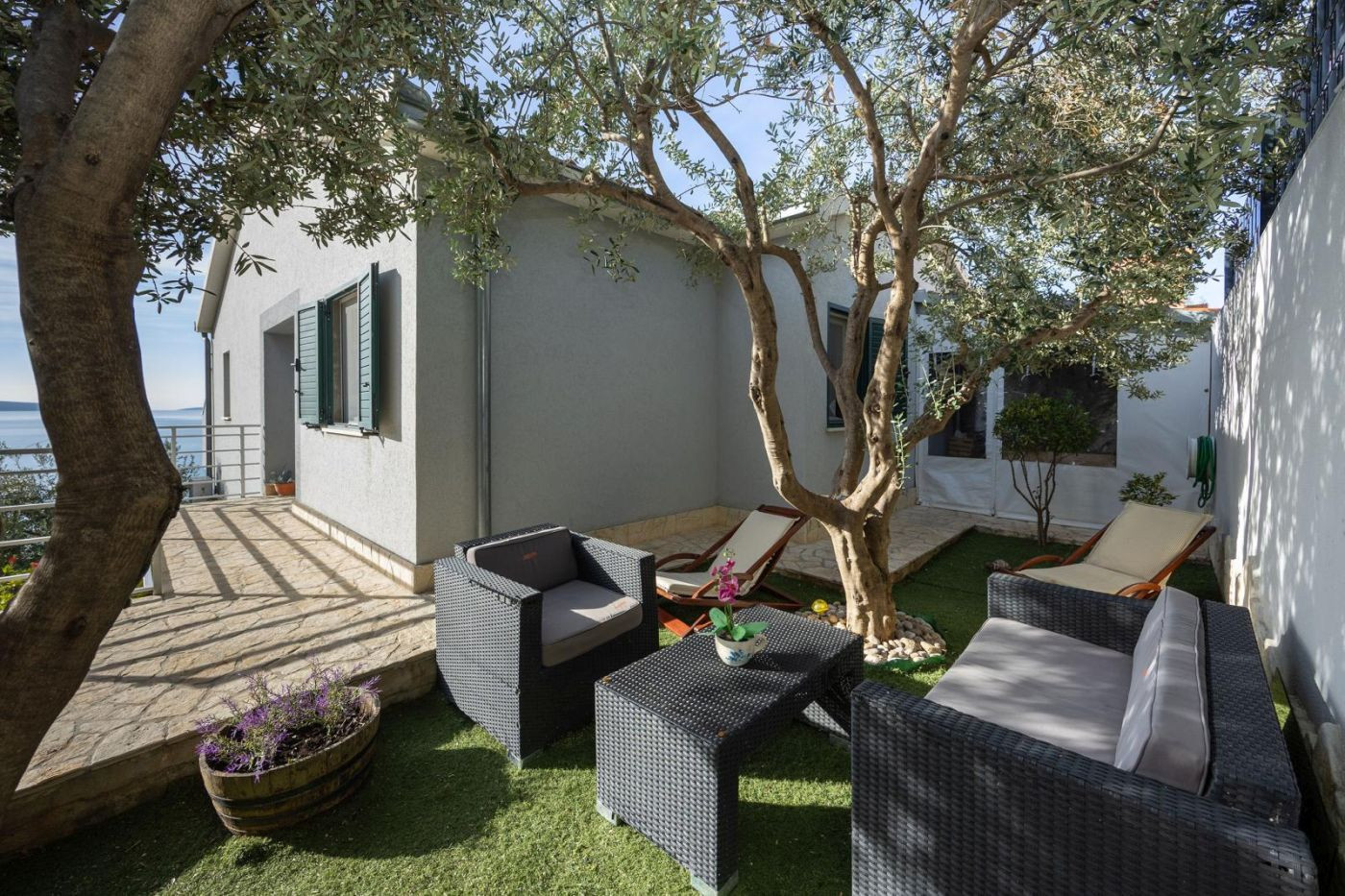 Besonders hervorzuheben ist die südlich ausgerichtete Terrasse mit Meerblick. Hier laden Tisch und Stühle sowie zwei Sonnenliegen dazu ein, den Tag entspannt zu beginnen oder bei Sonnenuntergang ausklingen zu lassen.